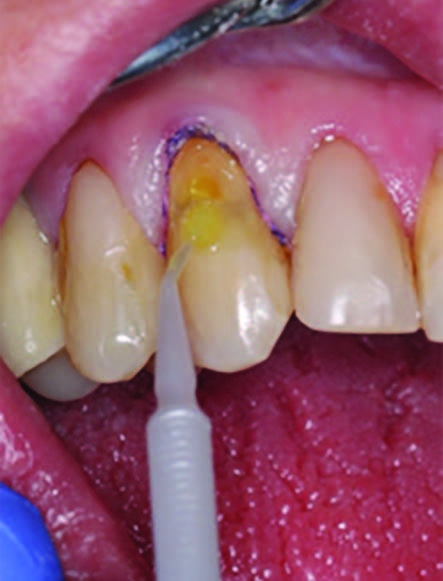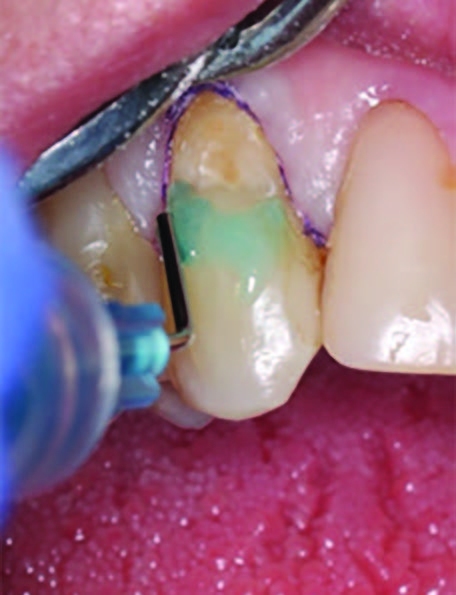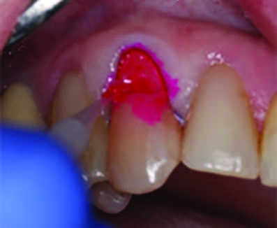 Figure 3. Application of caries indicator dye to identify the remaining infected tissue beneath the dislodged composite.