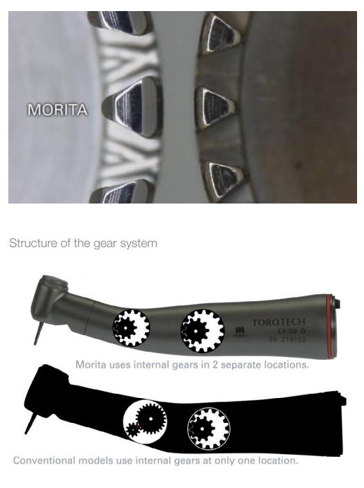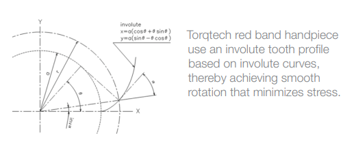 The Torqtech red band handpiece uses double internal gear sets. By using internal gears with inclined axes, despite the extreme difficulties in processing, the product achieves increased gear strength, durability, and access, thereby prioritizing precise treatment that benefits both dentists and patients.