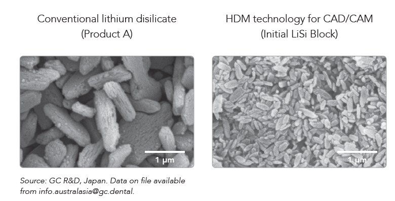 In 2016, with Initial LiSi Press, GC introduced HDM (High Density Micro-nization) technology, which uses equally dispersed lithium disilicate micro-crystals to fill the entire glass matrix rather than using traditional larger size crystals. The outstanding clinical performance of the HDM technology was shown in a randomized clinical trial after 4 years of service.8