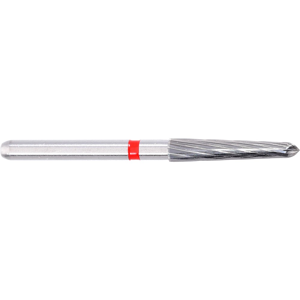 H284K tapered chamfer torpedo, 12 blade tungsten carbide for crown preparation finishing. FG 314 shank, size 018 (1.8mm diameter), with 10mm working length and 2 degree angle. Matches 879K diamond series.