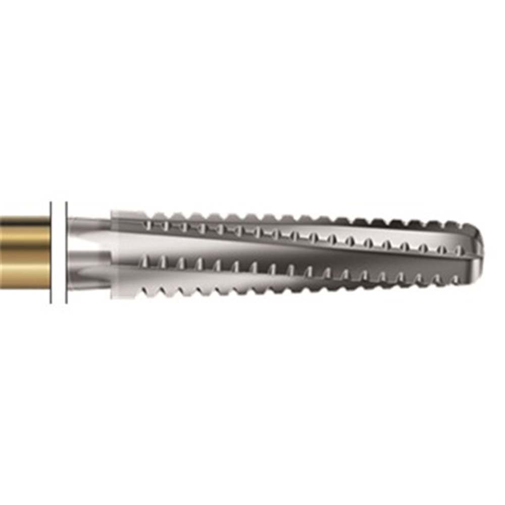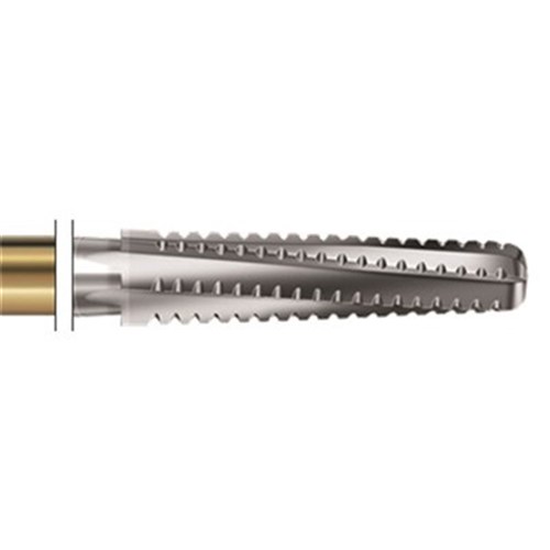 H847KRG tapered shoulder, rounded edge, tungsten carbide for intraoral work on titanium. FG 314 shank, size 020 (2.0mm) diameter with 8mm working length. Matches 847KR diamond series