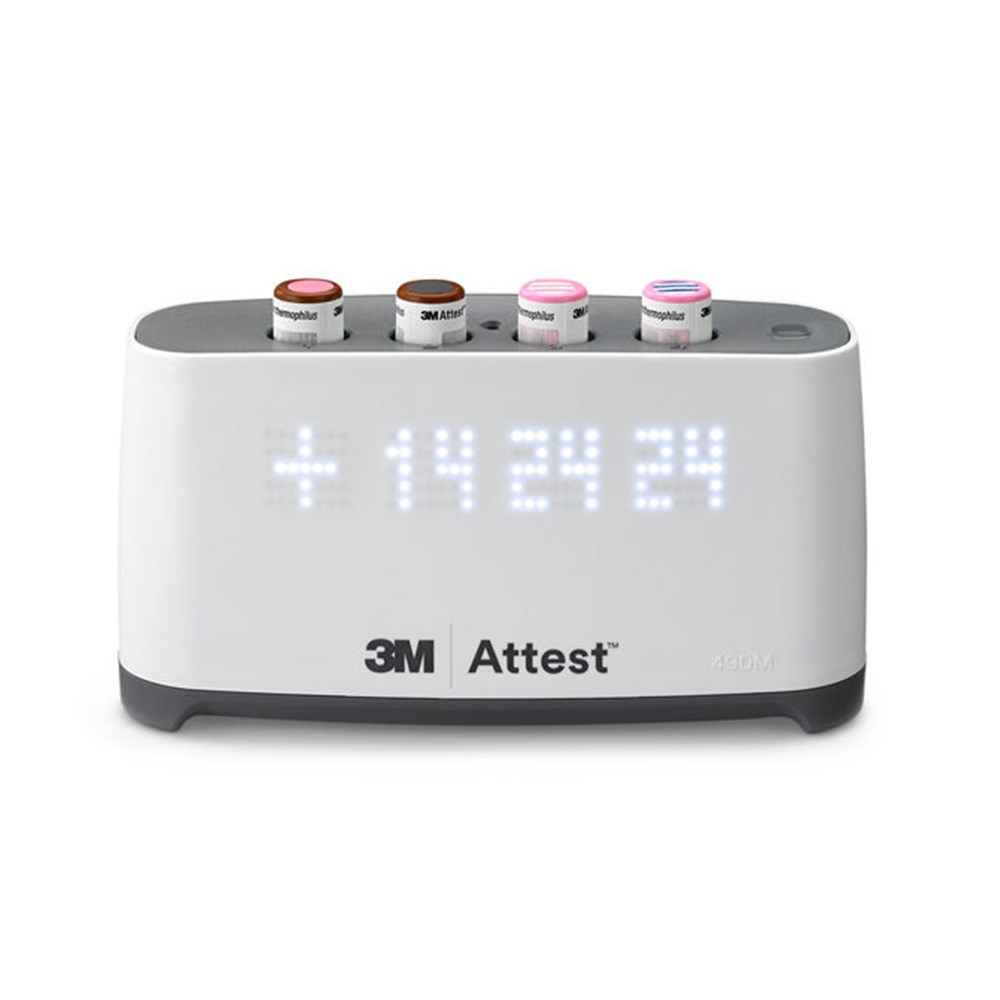 The 3M™ Attest™ Mini Auto-reader 490M has 4 wells, and is designed to incubate and automatically read 3M™ Attest™ Biological Indicators 1295, 1491, and 1492V at 60°C for a final negative fluorescence reading at 24 minutes.