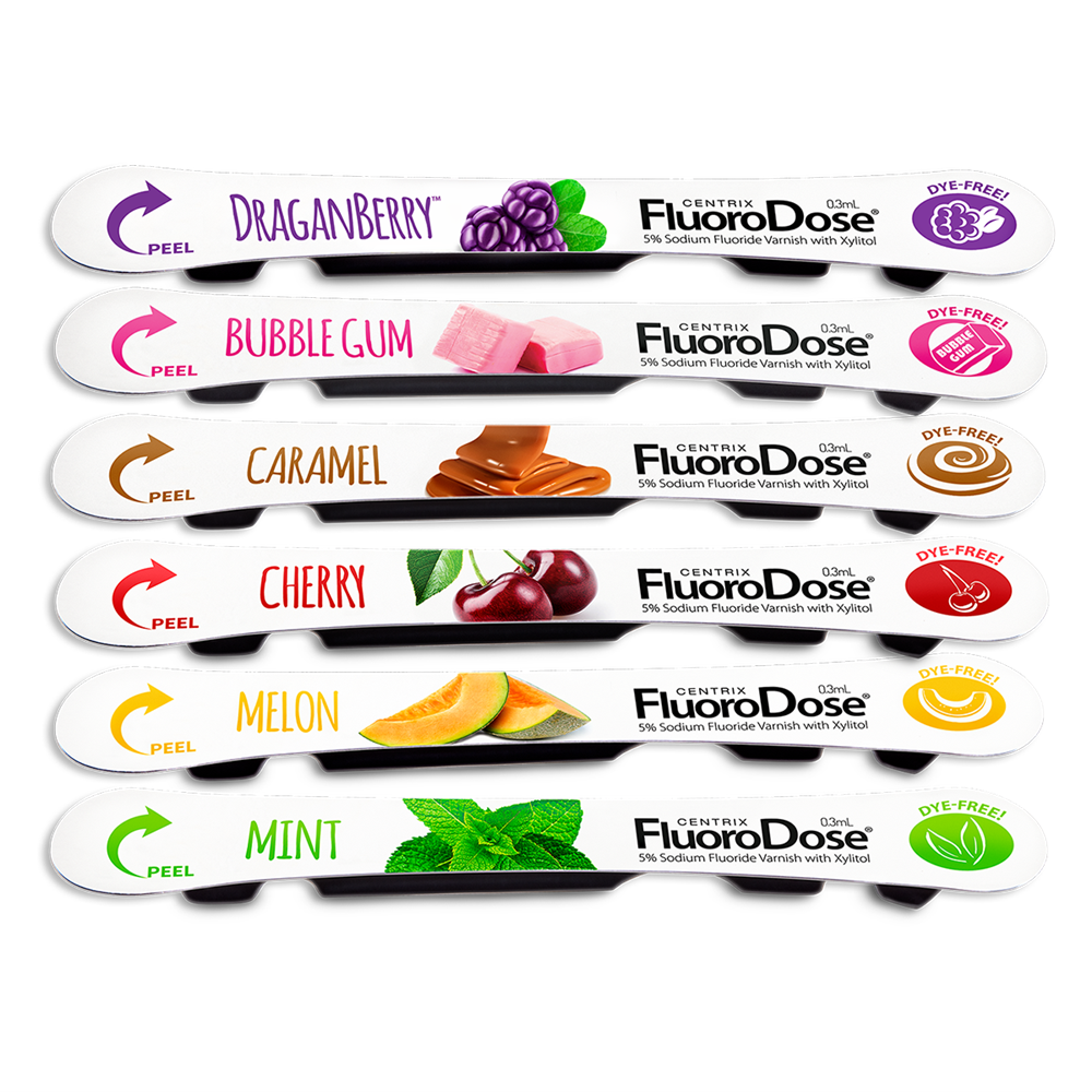 Centrix FluoroDose - Fluoride Varnish - Assorted - Caramel, Bubble Gum, Mint, Cherry, Melon and Dragan berry, 42-Pack