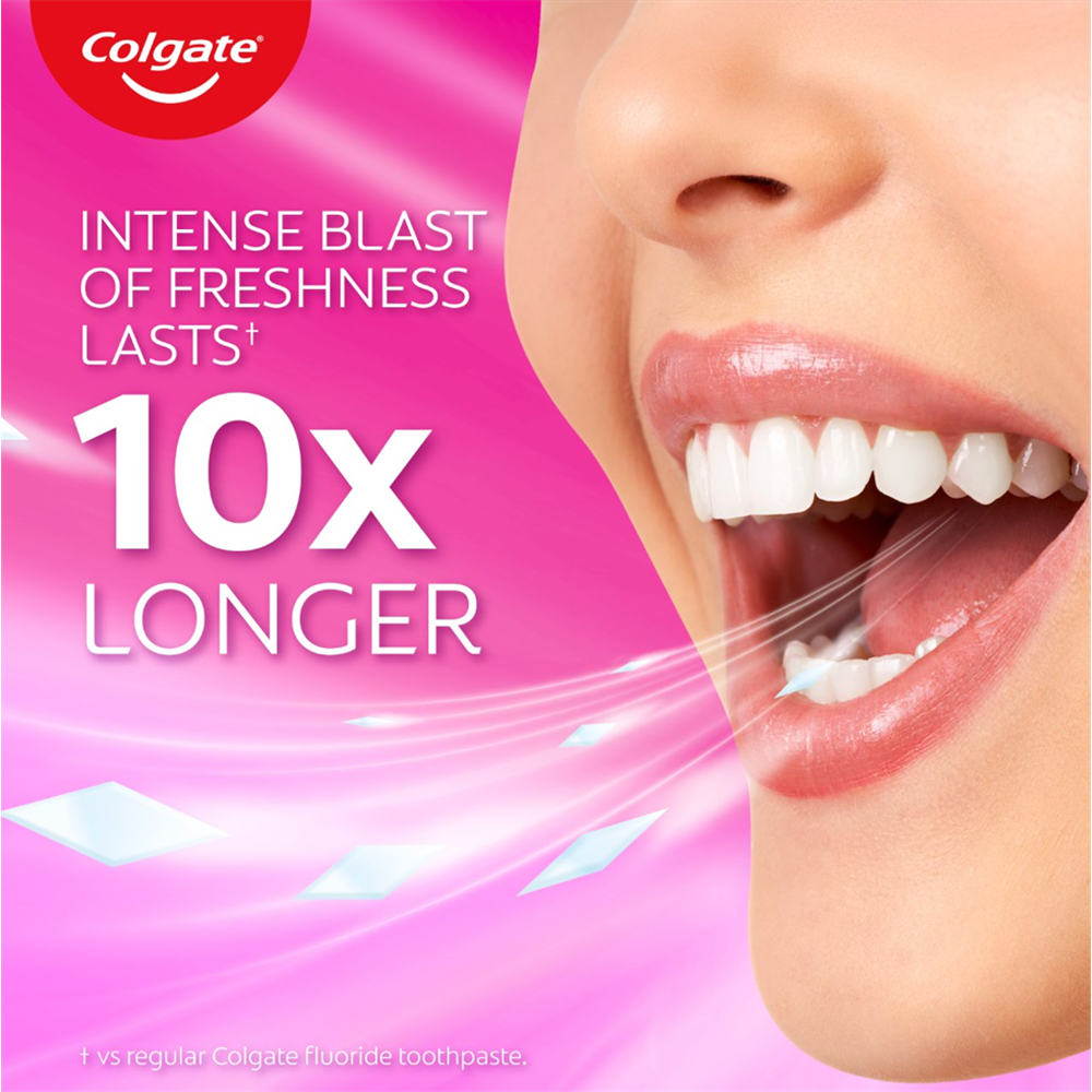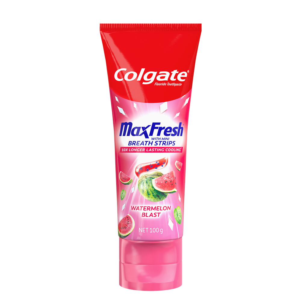 Experience flavour that wakes you with Colgate Max Fresh Watermelon Blast + Fluoride toothpaste with mini breath strips. Not only does it fight cavities and freshen breath, it will delight your senses and make brushing feel more enjoyable! Freshness that lasts for hours. Flavour: Watermelon Blast