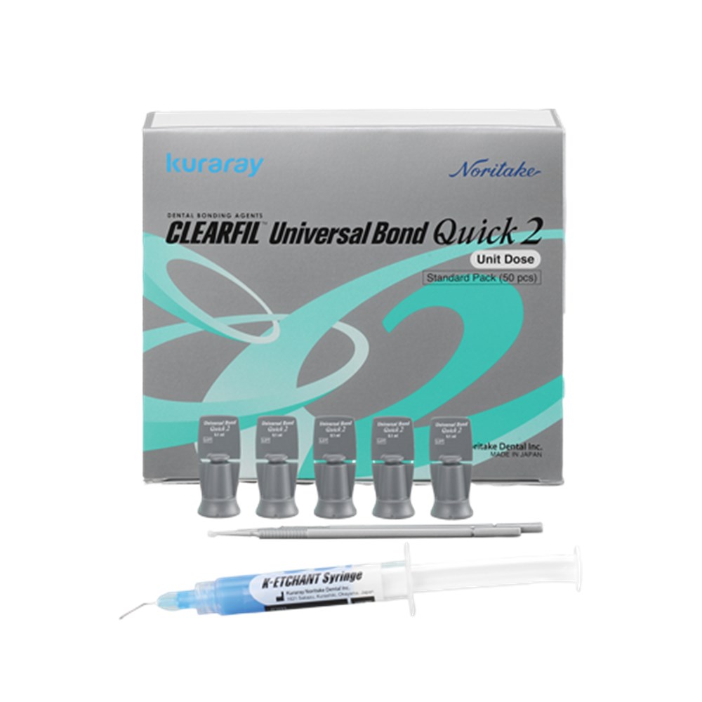 CLEARFIL™ Universal Bond Quick 2 includes the original MDP combined with unique AMIDE and new UTM monomers, that forms a thin, strong adhesive layer with no waiting time, resulting in Advanced Rapid Bond Technology. This combination improves the strength of the bonding layer, aimed at gaining reliability for one-step bonding and no refrigeration required for storage.