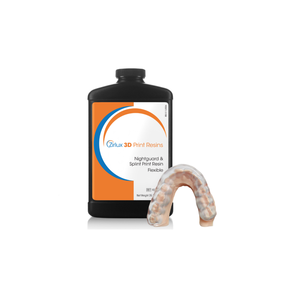 Zirlux Nightguard & Splint Resin- Flexible is a 510K cleared printing resin that is indicated for the fabrication of nightguards, splints, mouthguards, repositioners, and bleaching trays. This DLP-optimised resin is an exceptional printing material, that combines the strength needed to protect teeth against disorders like bruxism with added flexibility for better patient comfort.