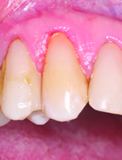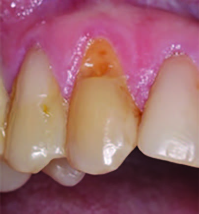 Initial presentation of tooth #6 showing the Class V lesion with dislodged previous restoration and exposed dentin.