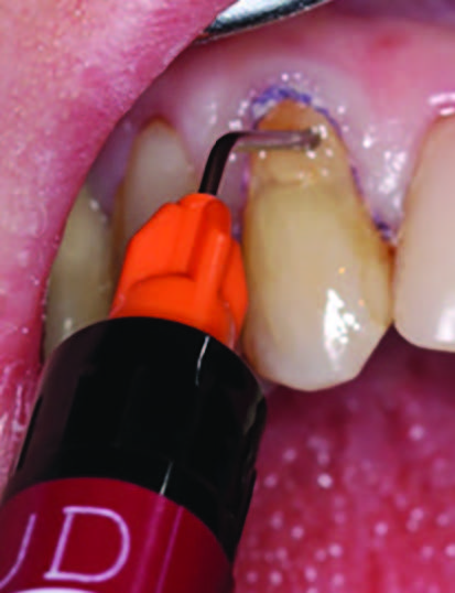 Figure 3. Application of caries indicator dye to identify the remaining infected tissue beneath the dislodged composite.