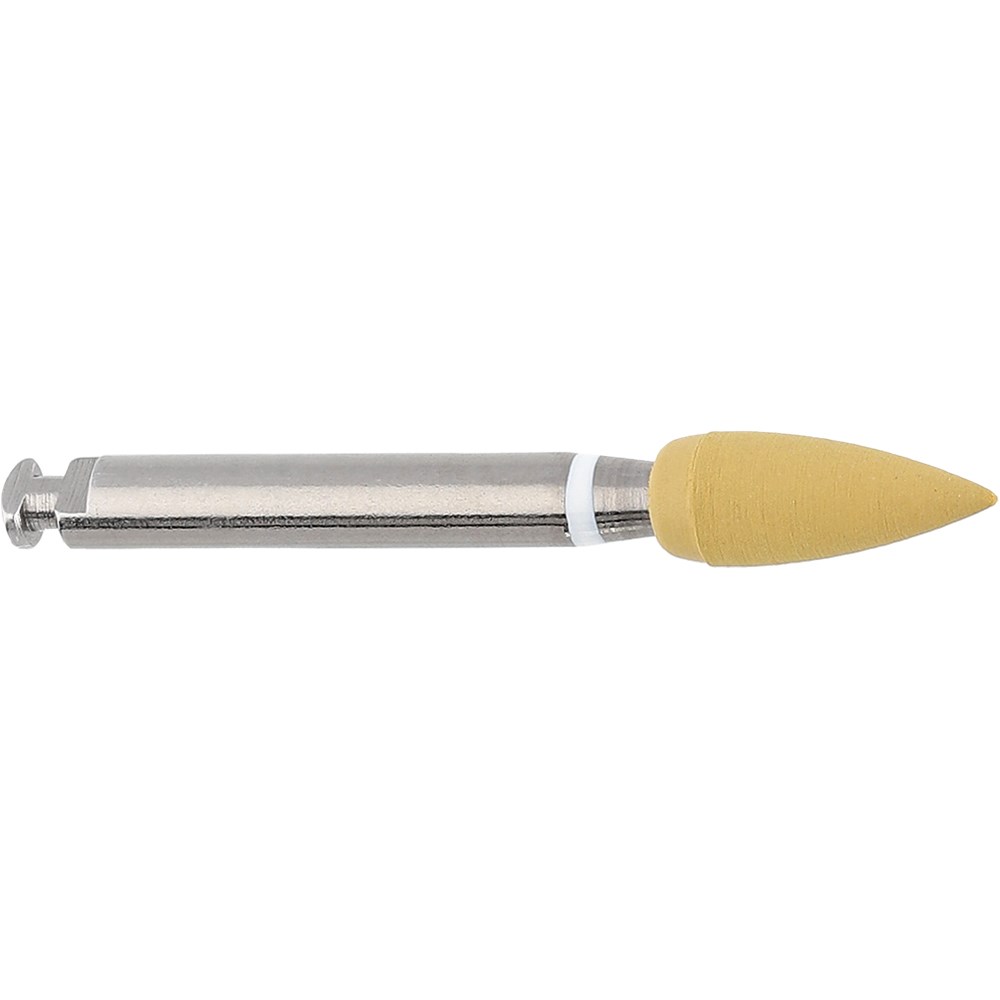 One-Step composite polishing point interspersed with diamond grit, RA 204, size 030 (3mm diameter) and 8.5mm working length. Use in combination with Q-Finishers. Use with spray coolant.