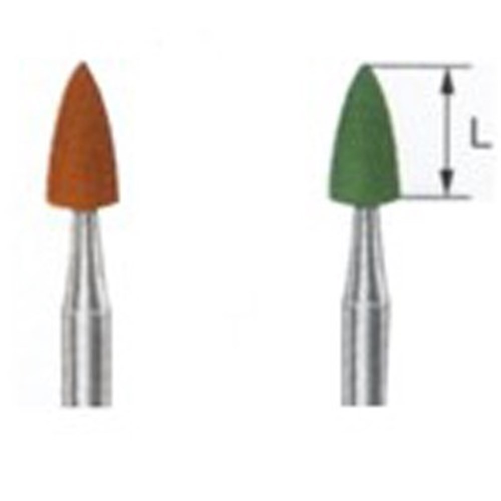 High-efficiency polisher for amalgam, precious metal and non-precious metal alloys used with spray coolant. Flame with RA 204 slow speed shank, size 030 and 6.6mm working length.