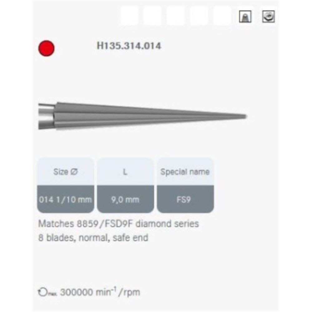 Tungsten carbide flame FG bur. 8 Blades, normal, safe end. Size 014 with 9mm working length. Matches 8859 / FSD9F diamond series.
