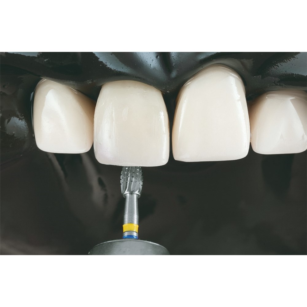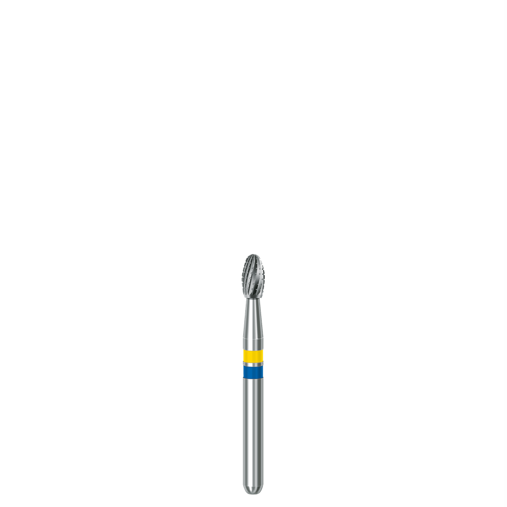 H379Q egg Q-Finisher for working on palatal/occlusal surfaces of composites. FG 314 shank, size 018 (1.8mm diameter), with 3.5mm working length. Q-Finisher for efficient work on composites to achieve optimal results. Tungsten carbide finishers create smooth surfaces in little time and Q-Finishers provide a more efficient finishing procedure. A better surface quality can be achieved after just one finishing step, due to the cross cut toothing specially designed for work on fillings.
