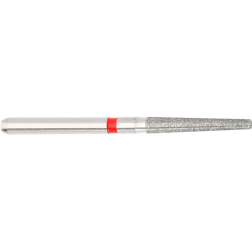 Long tapered shoulder for finishing crown preparation. Fine grit, FG 314, 016 diameter, 10mm working length with 1.8 degree taper.