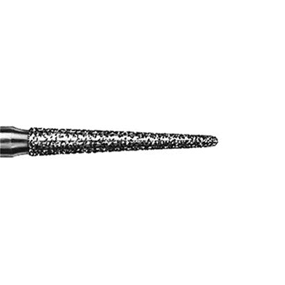 Tapered round long finishing bur for crown preparations. Fine grit, FG 314, 016 diameter 10mm working length with 2 degree taper.
