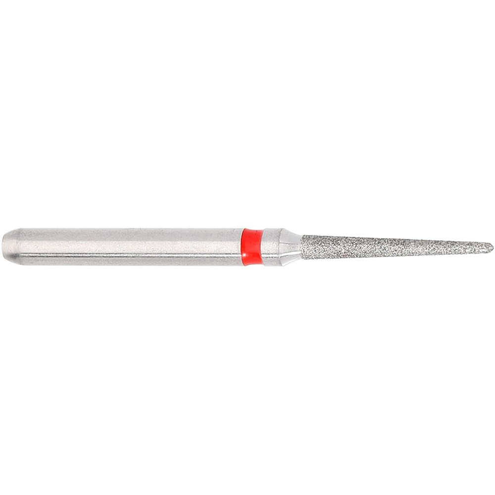 Pointed fine grit FG diamond 010, working length 8mm with 2 degree angle. Maximum recommended speed 300,000rpm, pk 5.