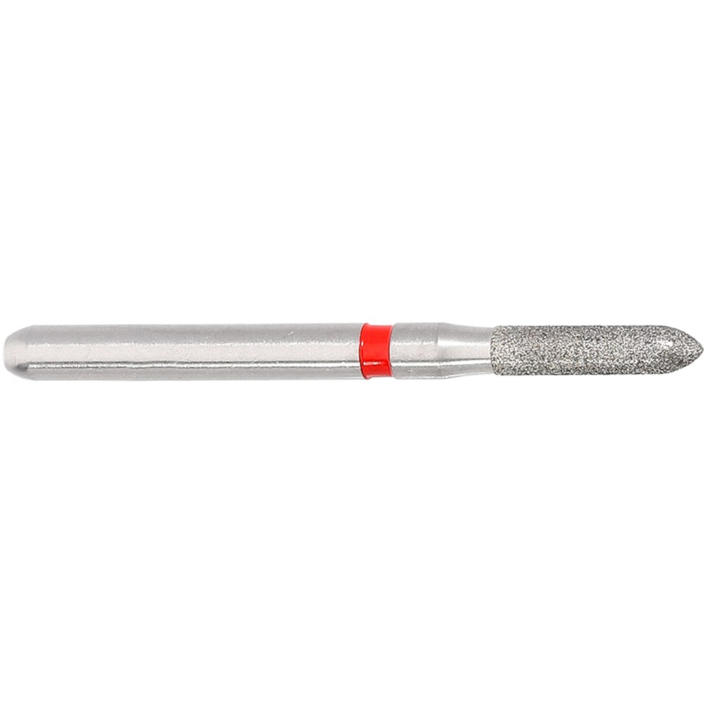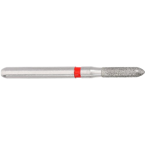 Short parallel chamfer, torpedo finisher for crown preparation or cavity preparation. Fine grit, friction grip diamond. Head diameter 014 (1.4mm) with 6mm working length. Matches H282 carbide finisher series