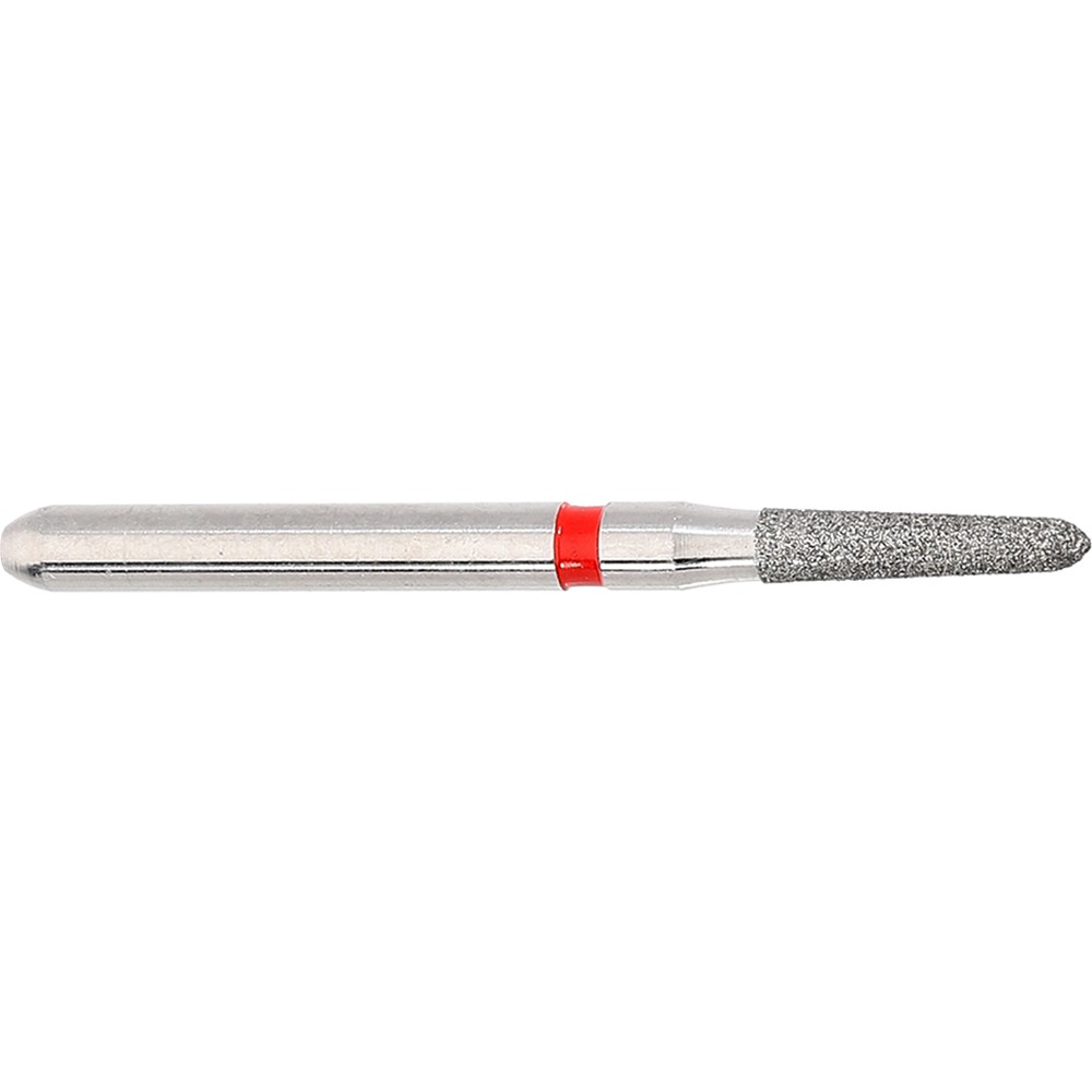 Short tapered chamfer, torpedo, fine grit, friction grip FG 314 diamond finisher for crown preparation or cavity preparation. Head diameter 014 (1.4mm) with 2 degree angle and 6mm working length. Matches H282K carbide finisher series