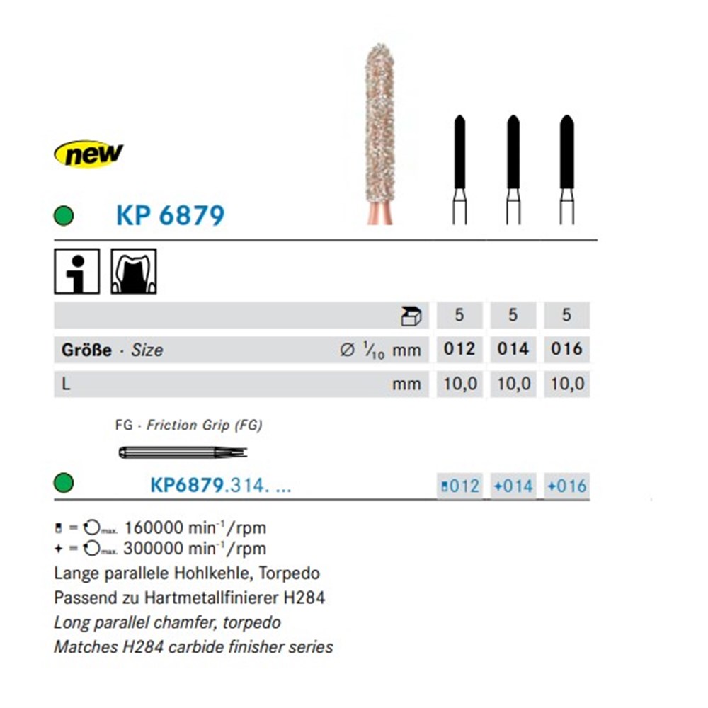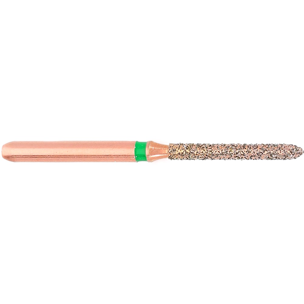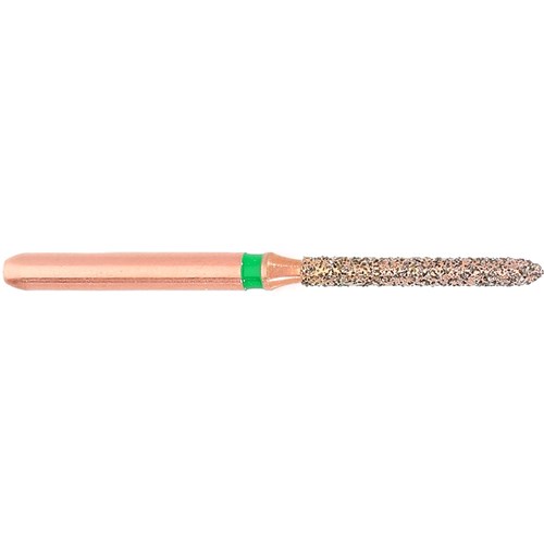 DIAO - KP6879 is a long parallel chamfer, torpedo shaped coarse, friction grip diamond used for crown preparation. Size 012 (1.2mm), with length 10.0mm.