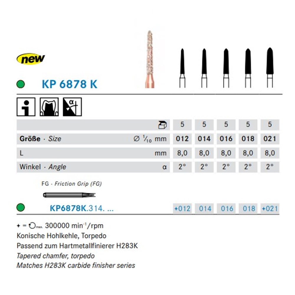 Use at an optimum speed of (160.000 rpm, preferably in a red-contra angle or alternatively in a turbine. Instruments that are subject to a speed limit of ) 300.000 rpm are not authorized for use in a turbine. (e.g. KP6370.314.030/035 or KP6845KR.314.025 – see information on the label)