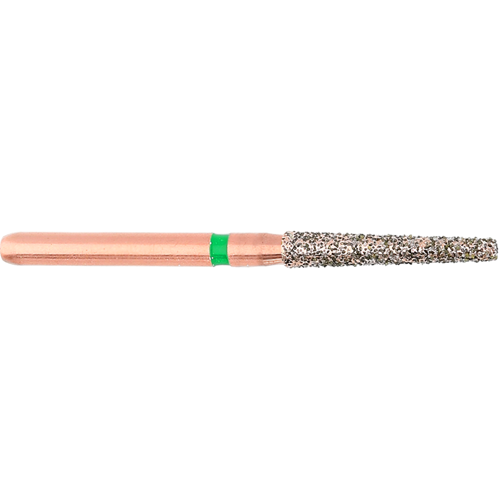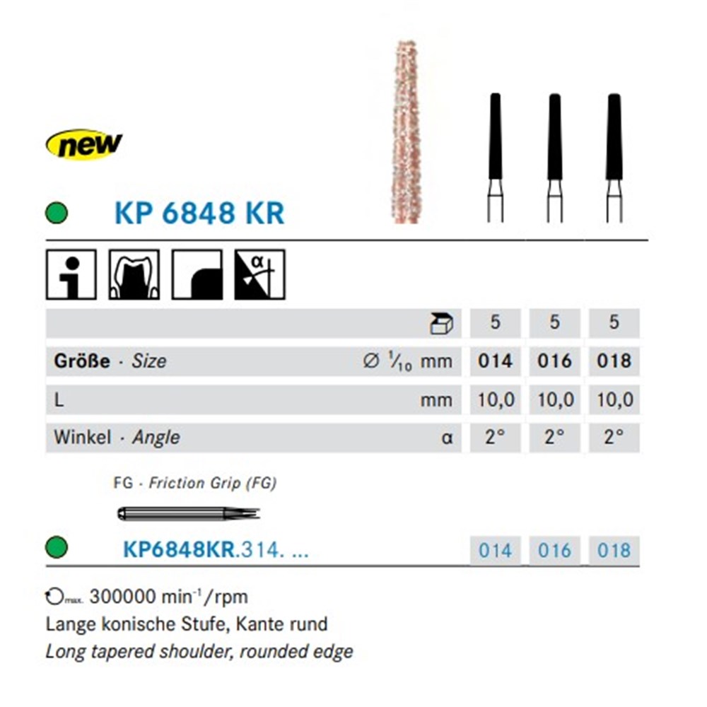DIAO - KP6848KR is a long tapered shoulder, rounded edge shaped coarse friction grip diamond used for crown preparation. Head diameter 018 (1.8mm) with 10mm working length and 2 degree angle.
