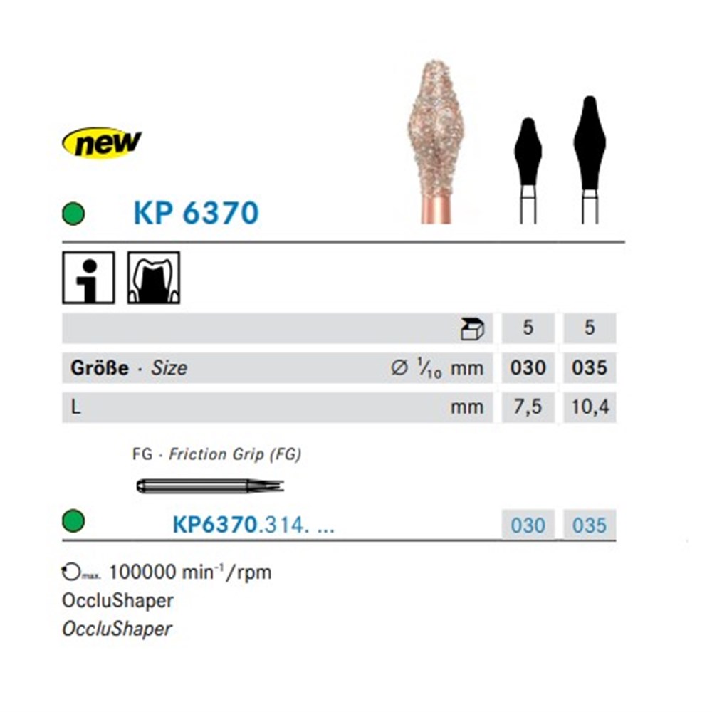 DIAO - KP6370 is an occlu shaped coarse, friction grip diamond used for occlusal contouring in crown preparations. FG 314 Size 030 with length of 7.5mm.