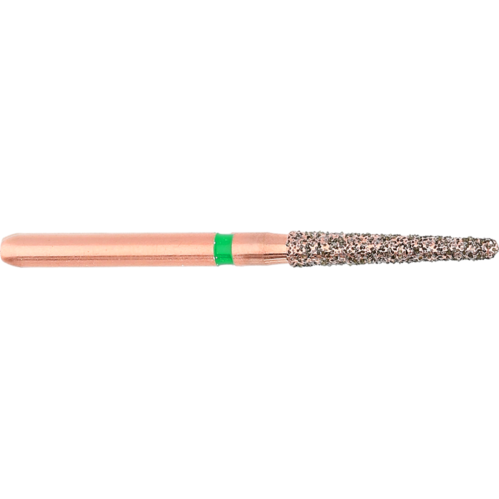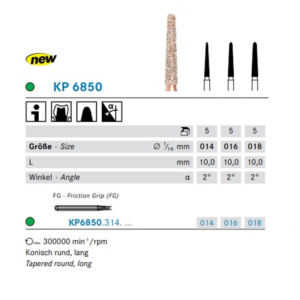DIAO - KP6850 is a long tapered round shaped coarse, friction grip diamond used for crown preparation. Size 018 (1.8mm) with length of 10.0mm, with 2° angle.