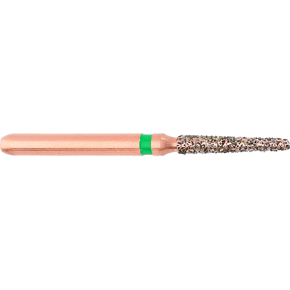 DIAO - KP6856 is a tapered chamfer round shaped coarse, friction grip diamond used for crown preparation. Size 014 (1.4mm) with length of 8.0mm, 2° angle.