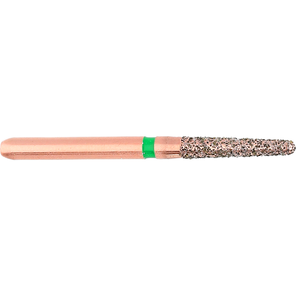 DIAO - KP6856 is a tapered chamfer round shaped coarse, firction grip diamond used for crown preparation. Size 016 (1.6mm) with length of 8.0mm, 2° angle.