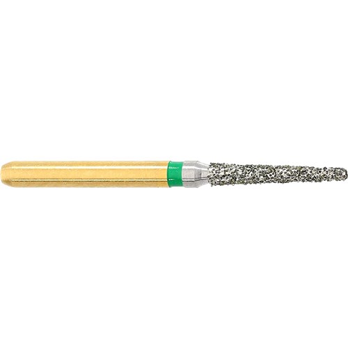 The S6847KR is a tapered shoulder, rounded edge, with a coarse (green) grit bur used for crown preparation.