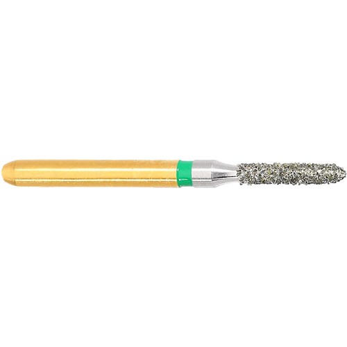 The S6877 is a short parallel chamfer, torpedo with a coarse (green) grit bur used for crown preparation.