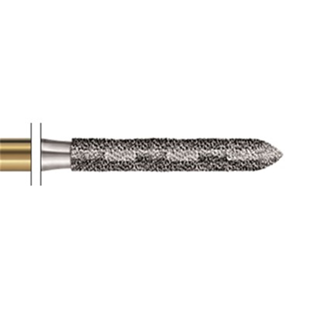 S-Diamond S6879 is a long parallel chamfer torpedo, coarse diamond used for crown preparation. FG 314 Size 012 (1.2mm), with length 10.0mm. Matches H284 carbide finisher series.