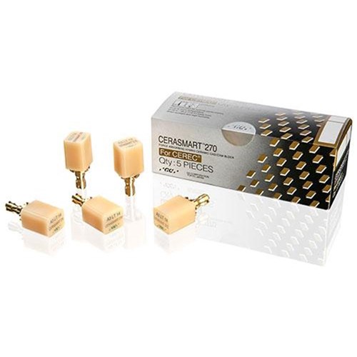 CERASMART® 270 CEREC CAD/CAM Block is an esthetic hybrid block formulated to provide fast and long-lasting clinical success. It features the newly developed ”Full Coverage Silane Coating” (FSC) with improved nanofiller technology for high physical and esthetic properties.