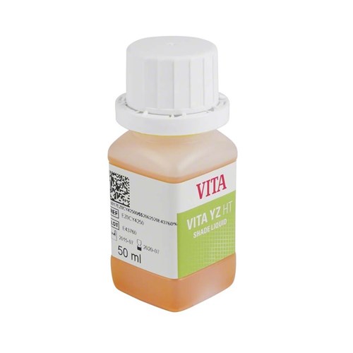 Liquids for custom coloring of monolithic VITA YZ HT restorations prior to sintering. VITA YZ HT SHADE LIQUIDs are available in 7 VITA classical A1 - D4 shades and in 7 VITA SYSTEM 3D-MASTER shades, as well as additional supplementary shades for the gingival, cervical and incisal areas.