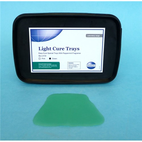 Easy cure special trays, allowing for the easy fabrication of custom impression trays. Ainsworth Light Cure Trays are soft, non-sticky and highly resistant to shrinkage and slumping when forming a handle. Cures quickly under halogen or UVA light. Attractive peppermint fragrance. Also available in Pink. Sold in packs of 50.