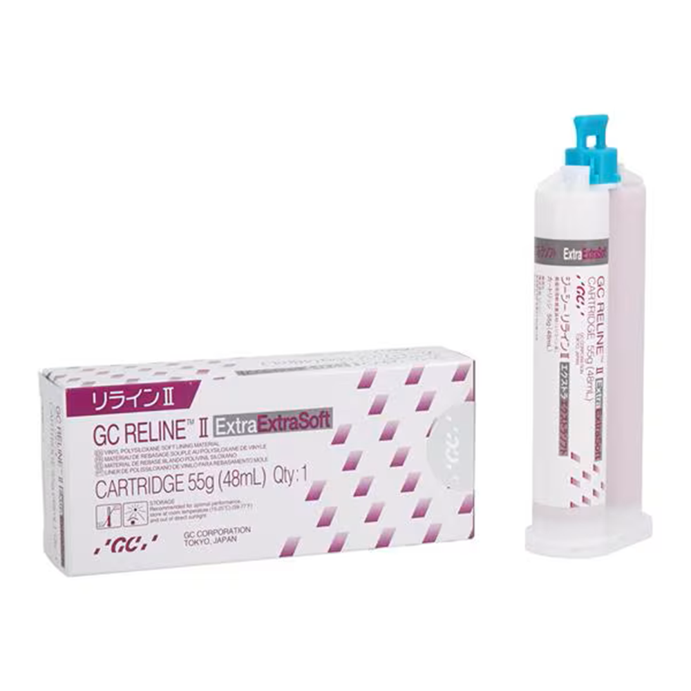 RELINE II is an A-silicone material providing comfort and long-lasting elasticity for indications of sharp or bony alveolar ridges and undercuts. It is used to adapt dentures after extractions or implant surgeries.