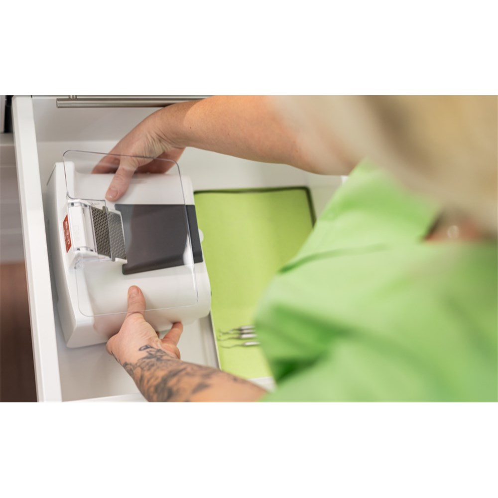 SILENT XS is also ideally suited or use, for example, in the CEREC workflow. After milling restorations from blocks or blanks, minor adjustments with the handpiece are usually necessary. The mobile suction unit prevents grinding dust from materials, such as zirconium oxide or PMMA, from contaminating the air and settling on sensitive equipment, office furniture or the floor.