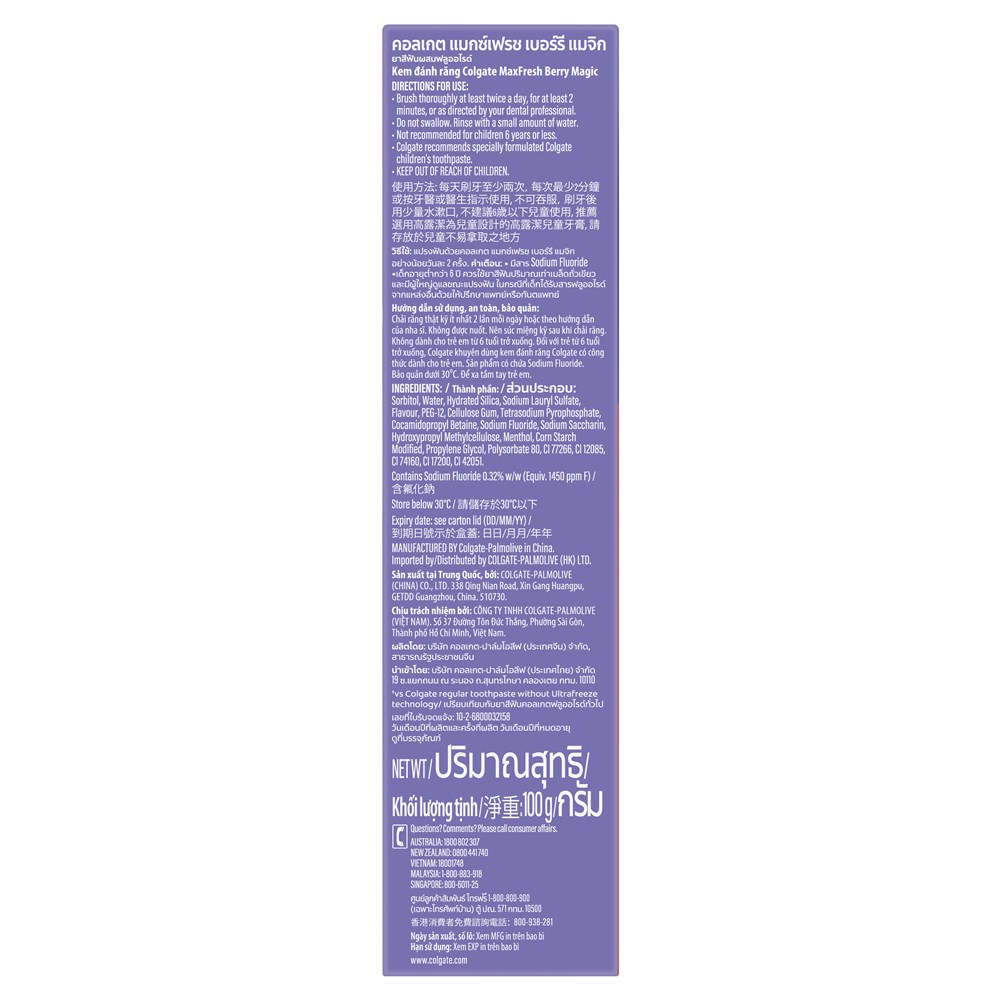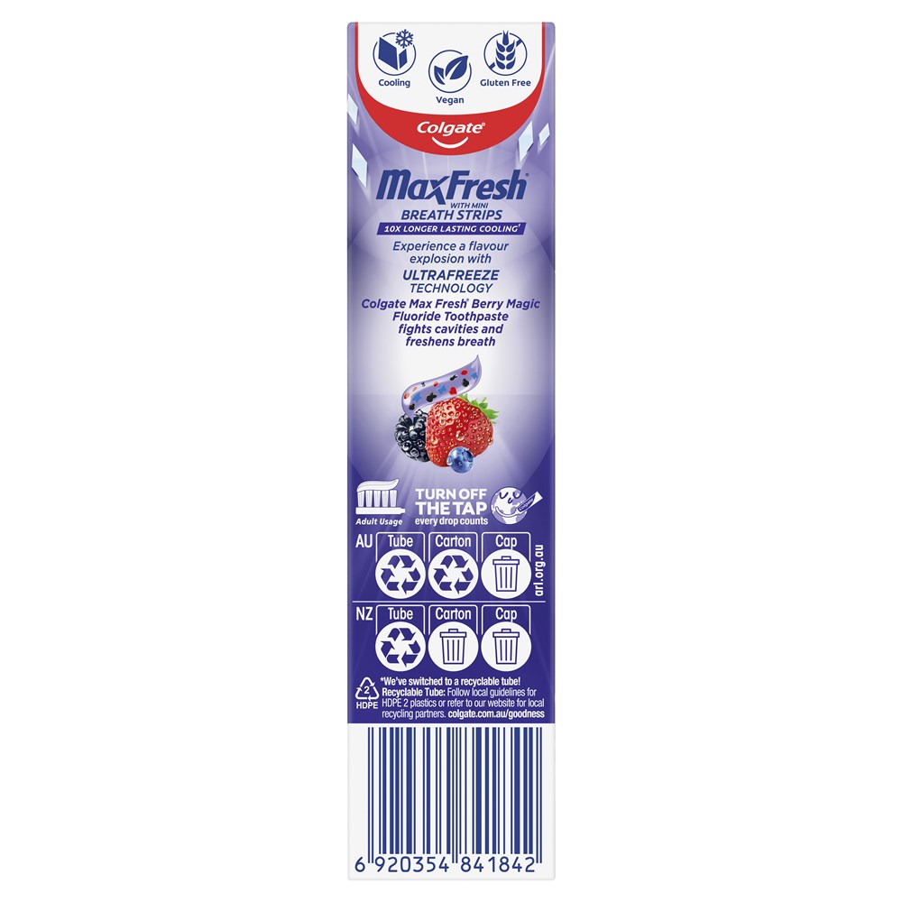 Experience a flavour explosion with Colgate Max Fresh Berry Magic + Fluoride toothpaste with mini breath strips.