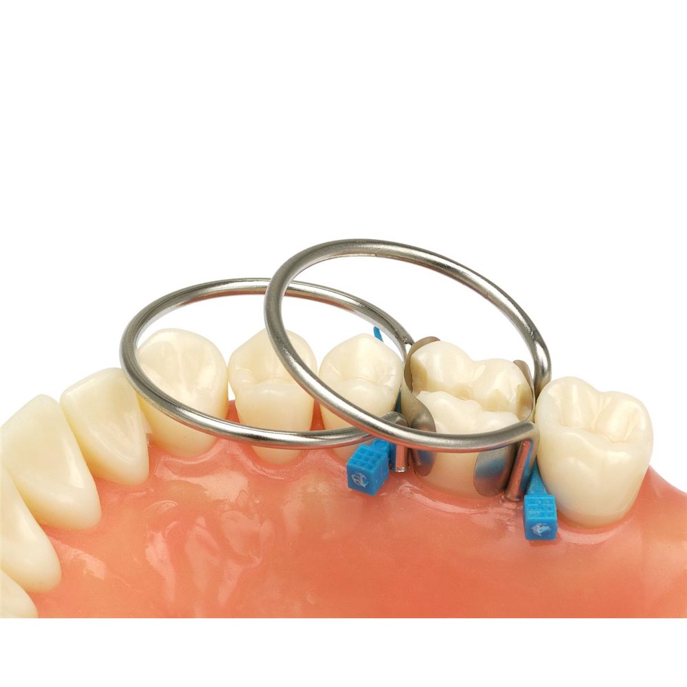 Hardened spring steel allows for easy placement with rubber dam forceps. G-Rings come in two tine lengths: Standard length is used for class II restorations; Long length allow overlay of rings for MOD or multiple tooth restorations. Burnished ends grip teeth at the gum line, keeping rings securely in place.