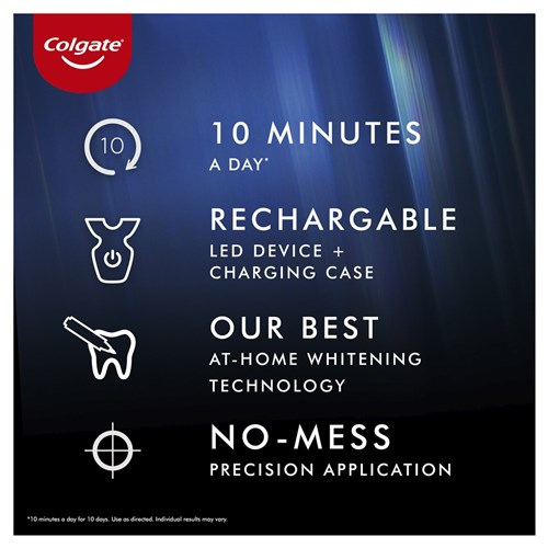 Reveal your whiter, brighter smile with Colgate® Optic White® Light-Up Dentist Exclusive Kit. A Professional, Take-Home Teeth Whitening Kit with an LED Teeth Whitening Device, Whitening Serum Pen and 6% hydrogen peroxide, for dramatically whiter teeth in 5 days*.